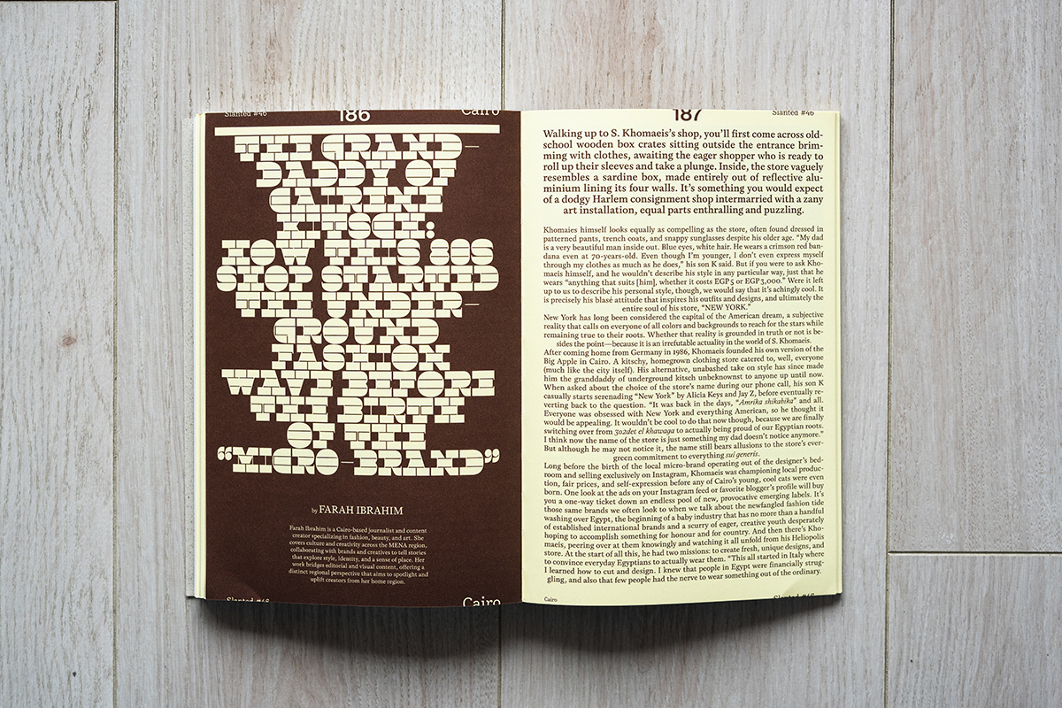 El magazine aborda diferentes disciplinas mientras que descubrimos la cultura visual de El Cairo: tipografía, diseño gráfico, comunicación visual, arquitectura e incluso diseño de producto. Todas estas áreas, de forma aislada y por qué no, también unidas, definen y modelan el presente y el futuro cultural ya no solo de esta región, si no de cualquier lugar del mundo.