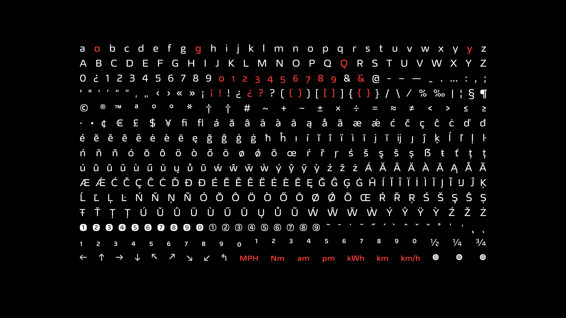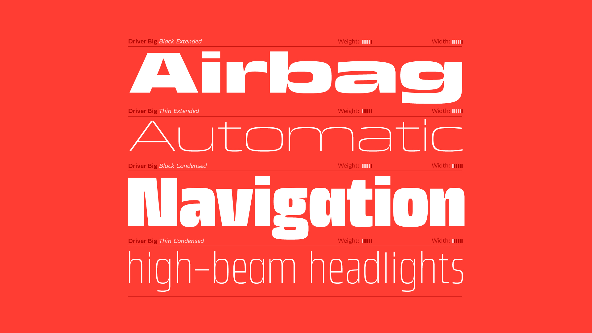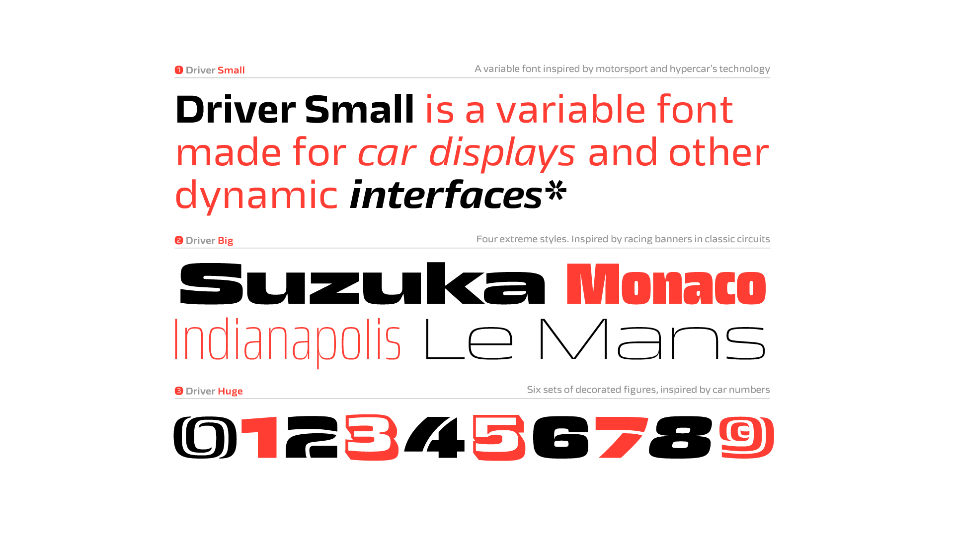 PG: Pues ha sido un experimento fantástico. Driver es una familia para coches, con tres niveles: Driver Small es una variable font para tamaños pequeños en pantallas digitales. Tiene 4 ejes (ancho, grosor, intensidad y ajuste óptico) que ajustan las formas a las necesidades de tamaño, iluminación, jerarquía, color de fondo… Además ciertos glifos están diseñados para reconocerse rápidamente y funcionar bien en tamaños pequeños.