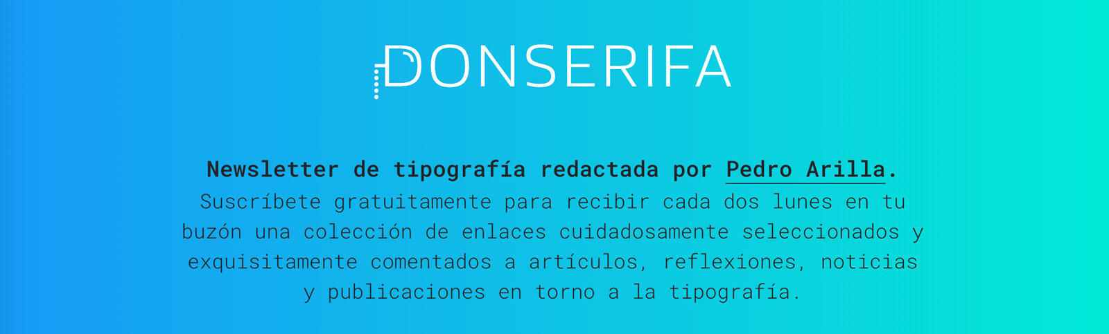 Don Serifa nos da buenas noticias. Regresa el 12 de marzo, coincidiendo con su séptimo aniversario. Por lo pronto, arrancará con el envío de newsletters bimensuales. ¿Te interesa? Regístrate en su web antes del 12 de marzo porque, además, entrarás a participar en el sorteo de tote-bags y especímenes tipográficos de la fundición tipográfica Fontsmith, y los libros ‘Diseñadores en la nebulosa’ (José María Cerezo), ‘Diseño para la edición’ (Jan V. White) y ‘Cómo crear tipografías’ (Cristóbal Henestrosa, Laura Meseguer y José Scaglione).