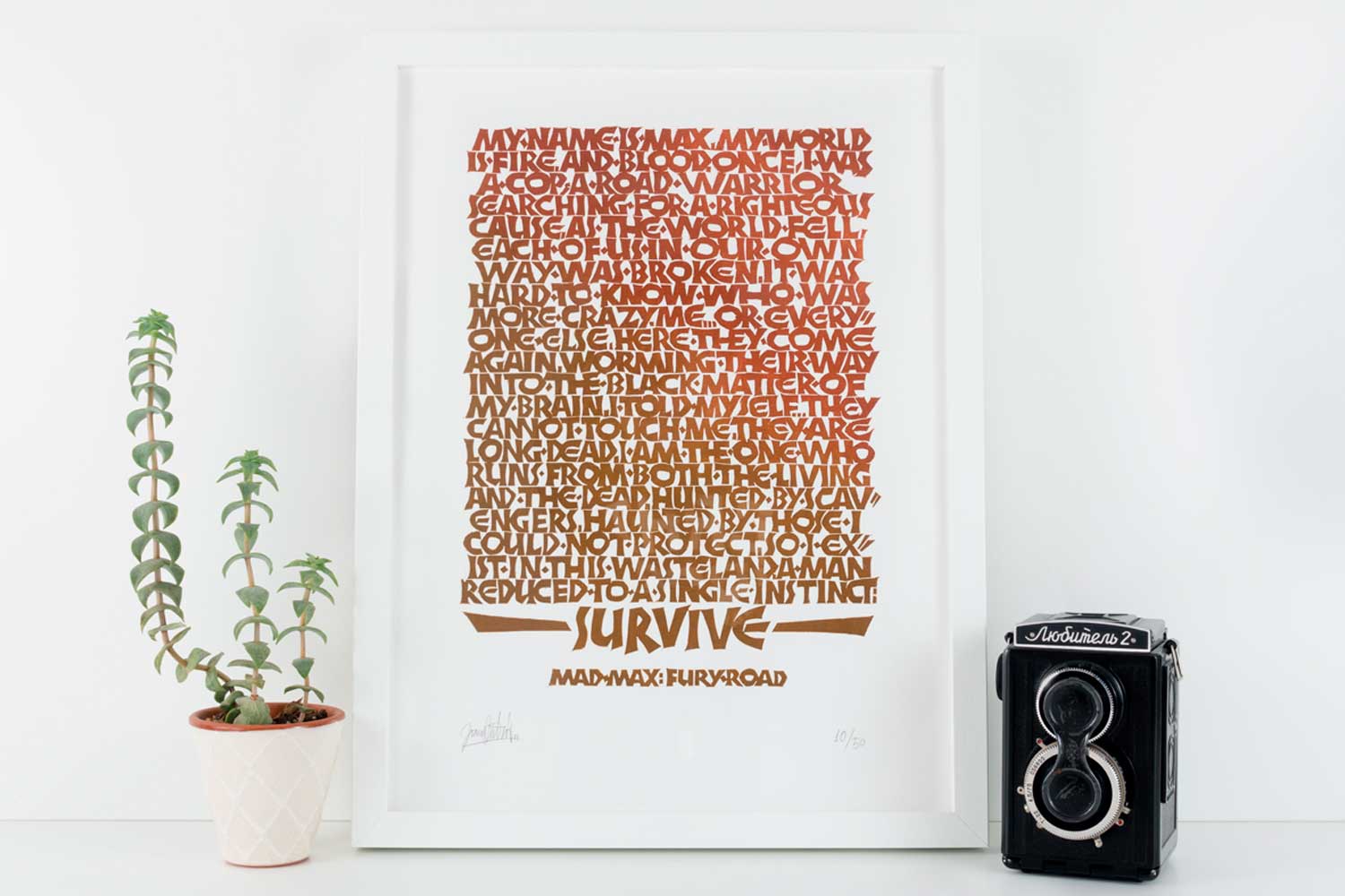 Os traemos una delicia del gran calígrafo Joan Quirós. Se trata de una edición limitada y numerada de 50 ejemplares impresos manualmente y realizados con la técnica de grabado en linóleo. Un trabajo de caligrafía impecable inspirado en Mad Max. ¡Corre que se acaban!