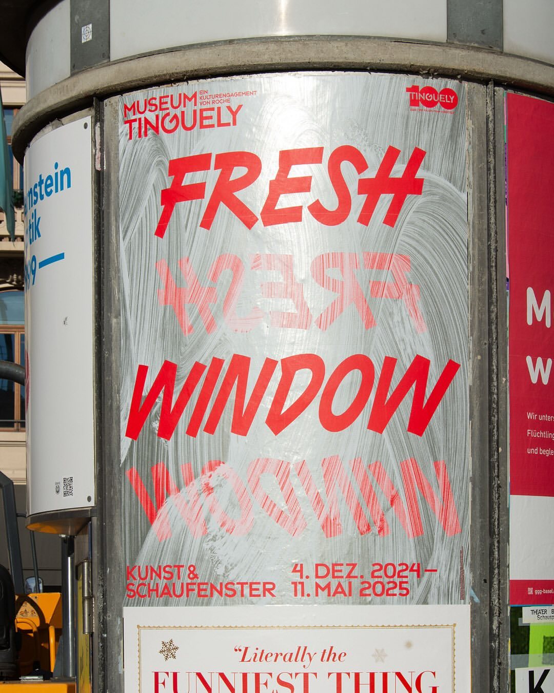 Esta campaña gráfica de Sylvan Lanz para la exposición Fresh Windows: The Art of Display & Display of Art, en el Museum Tinguely de Basilea, en Suiza, se inspira en letras pintadas a mano sobre cristales, al modo de los rótulos comerciales sobre fachadas y cristaleras.