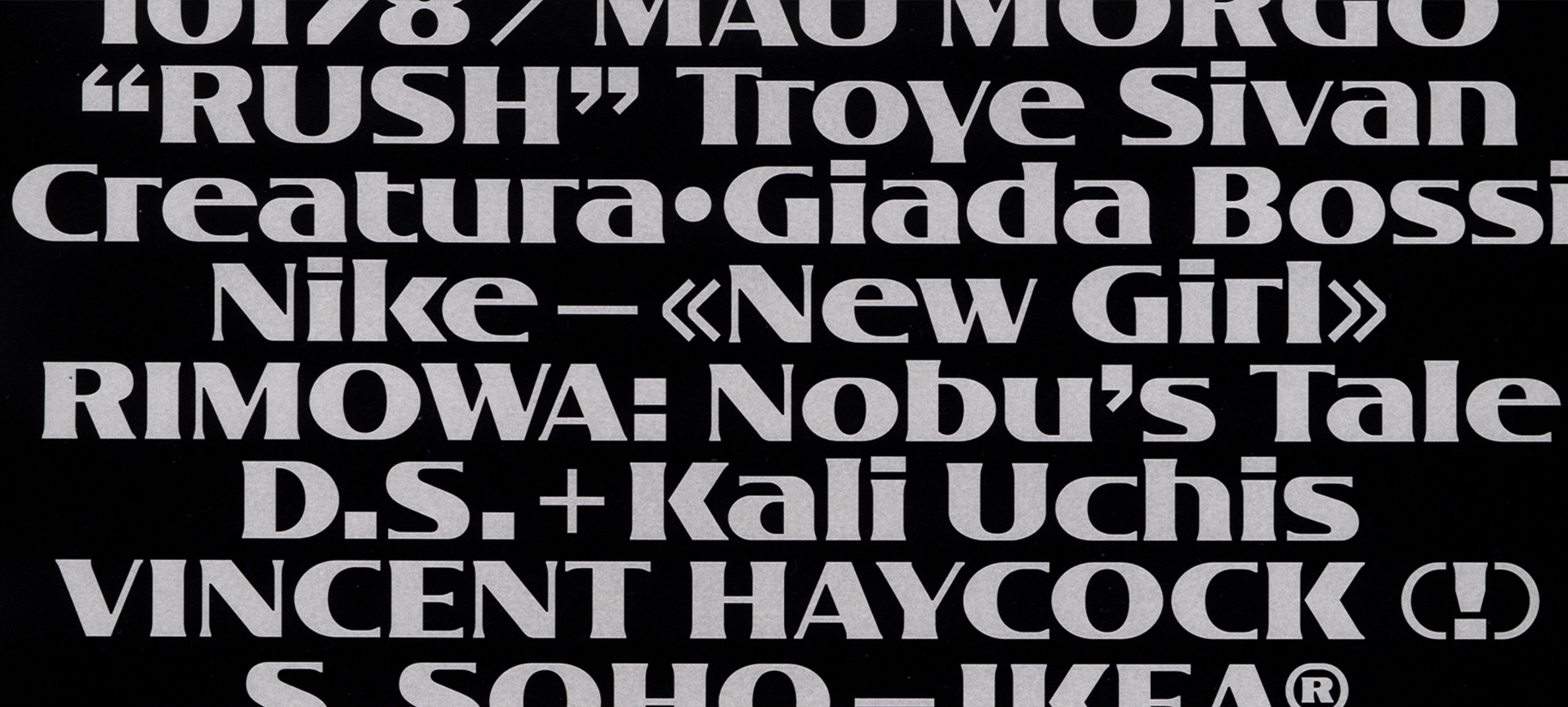 Siguiendo con las serifas, cuyo universo visual y sobre todo conceptual es mucho más amplio y variado de lo que comúnmente se cree, nos adentramos en un territorio de donde este estilo se vuelve un tanto más excéntrico y caprichoso. Tradicionalmente confinadas en los límites del texto corrido, desde hace tiempo demuestran que pueden ser también expresivas y emocionantes. Quizá este movimiento se produzca como reacción a la abrumadora proliferación de grotescas neutras, limpias y minimalistas, siempre correctas y sofisticadas, lo que ha generado un ecosistema visual un tanto monótono de marcas muy parecidas entre sí.