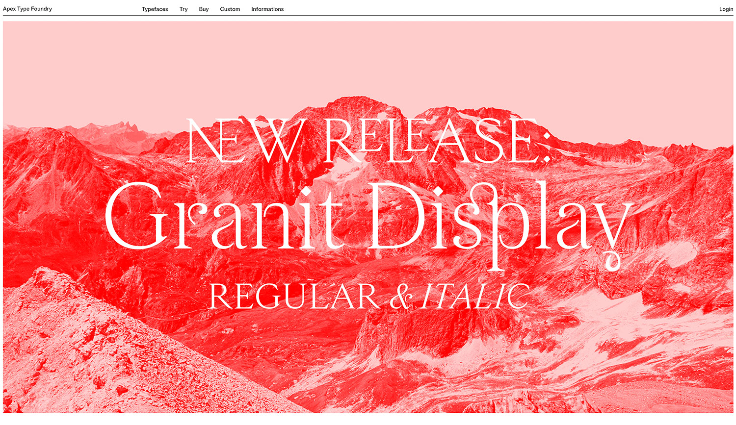 Apex Type Foundry es la fundición tipográfica digital de Alex Chavot, diseñador gráfico y tipográfico francés, autor de un amplio catálogo de fuentes, que abarca desde afiladas stencil como Hazel, expresivas condensadas como Smithee, o grotescas de toques humanistas con pronunciadas «trampas de tinta» como Gortex.