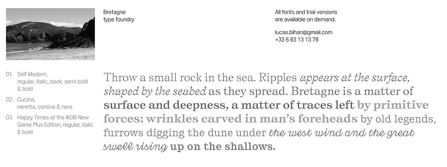 Detrás de la misteriosa Bretagne Type Foundry se encuentra el diseñador (bretón, por supuesto) Lucas Le Bihan. Misteriosa digo, porque, aunque, como es lógico, aparece el nombre del diseñador tipográfico, no hay más información de ninguna otra clase, salvo las descripciones de las fuentes tipográficas del catálogo. Una vez localizada la web de Le Bihan, podemos saber que Bretagne Type Foundry está activa desde 2016.