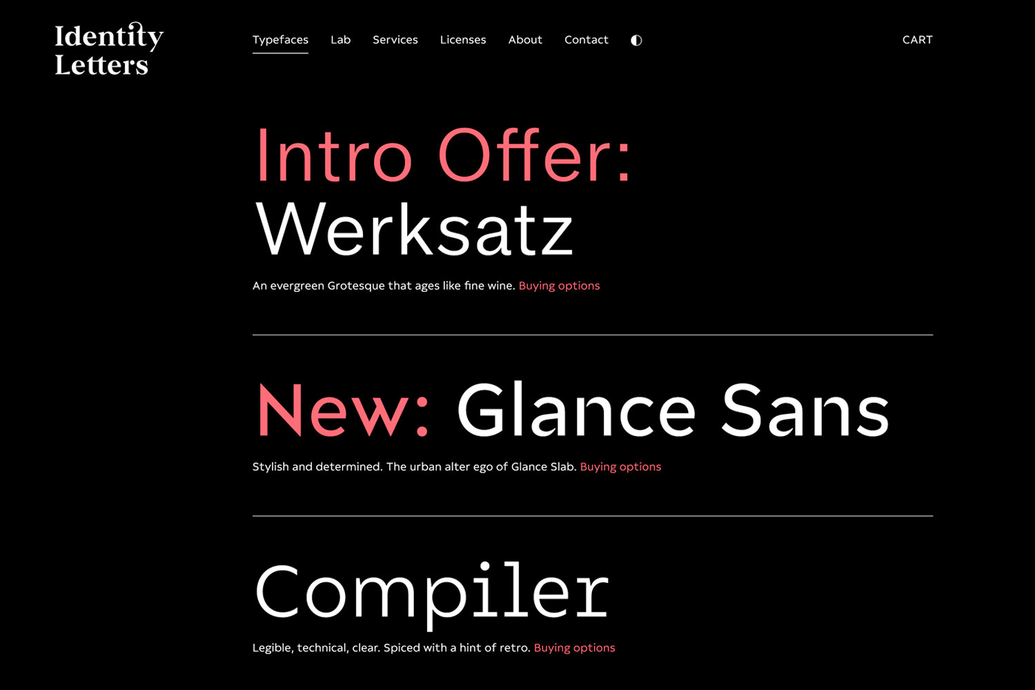 Identity Letters tienen su sede en Alemania y está capitaneada por el diseñador tipográfico Moritz Kleinsorge y la diseñadora gráfica e ilustradora Kathrin Borhof. Su estilo es conciso, esencial. Sus fuentes, funcionales y precisas, van al grano, con ese toque elegante de lo que está en su exacto lugar. De su catálogo destaca la familia Glance, formada por dos tipos hermanas, Glance Slab y Glance Sans. De fuerte carácter visual, ambas suponen una incursión en el territorio de la experimentación tipográfica. Sus elementos no unidos, flotantes, las dota de un aroma de ligereza y despreocupación muy atractivo y estimulante, tanto en los pesos finos como en los más gruesos.