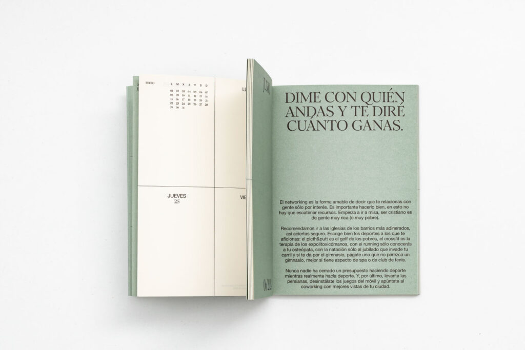 Por lo demás, la agenda mantiene su diseño minimalista a semana vista, sin imágenes ni artefactos, con mucho espacio para escribir y fechas fiscales para ayudarte a no llegar tarde a ninguno de los pagos estipulados. Sus portadillas interiores nos regalan consejos (en clave de humor) para convertir el mundo freelance en un lugar más habitable.
