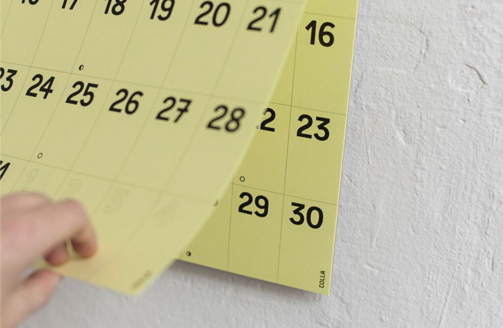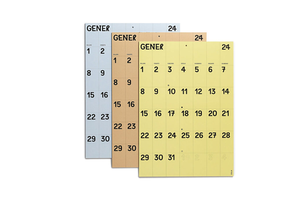 Volvemos al diseño simple y funcional, sin artificios ni florituras (pero no por ello menos bello). El calendario de pared de Colla Paper está disponible en tres colores: azul claro, amarillo claro y marrón claro, y en dos idiomas: castellano y catalán/valenciano.