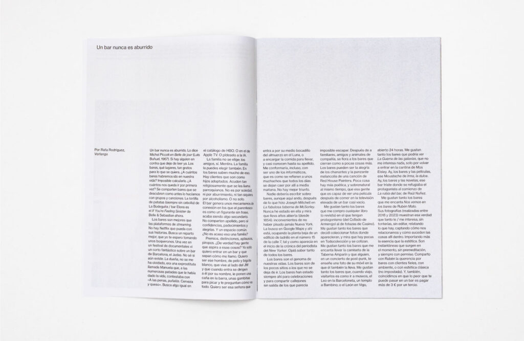 Rubén Malo retrata en este librito bares y momentos vividos en ellos: una caña, unas bravas, una partida de cartas, un servilletero, una terraza, un cartel anunciando arroces, una silla esperando un cliente, un refugio para el último lector de prensa en papel, un bocata de jamón, una barra.