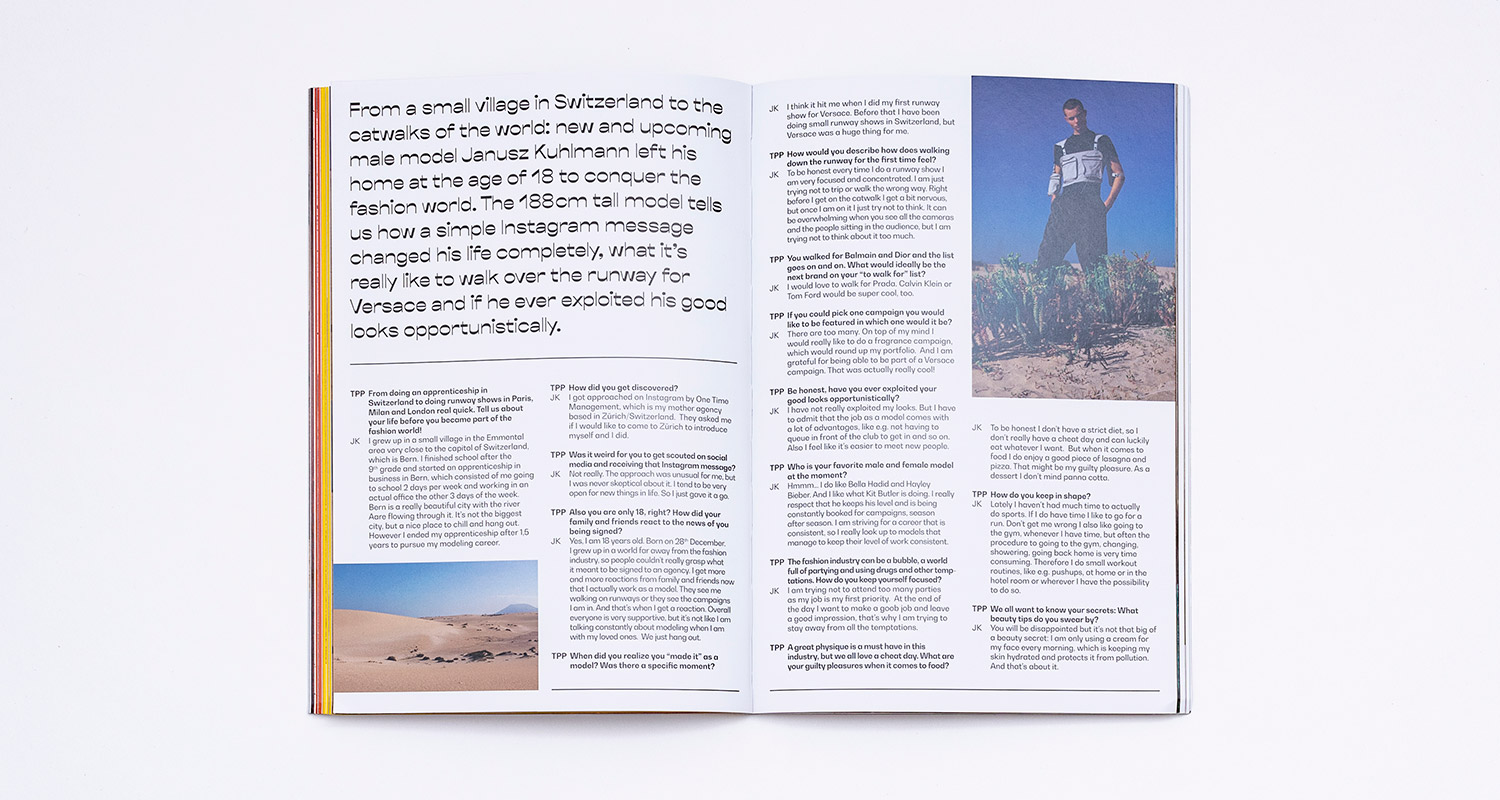 «Normalmente las agencias quieren mover nuevas caras, con lo que conseguir a alguien con más repercusión cuesta más. No obstante, en el caso de Janusz tengo muy buena relación con su booker. Lo conocí recién creada la revista, y siempre ha creído en ella. Cuando hicimos el casting para la portada, teníamos 2 opciones de su agencia, pero ambos estaban ocupados el día del shooting. Necesitábamos a alguien potente, así que nos ofreció la opción de Janusz, y no dudamos en llevárnoslo a Canarias para realizar la producción».