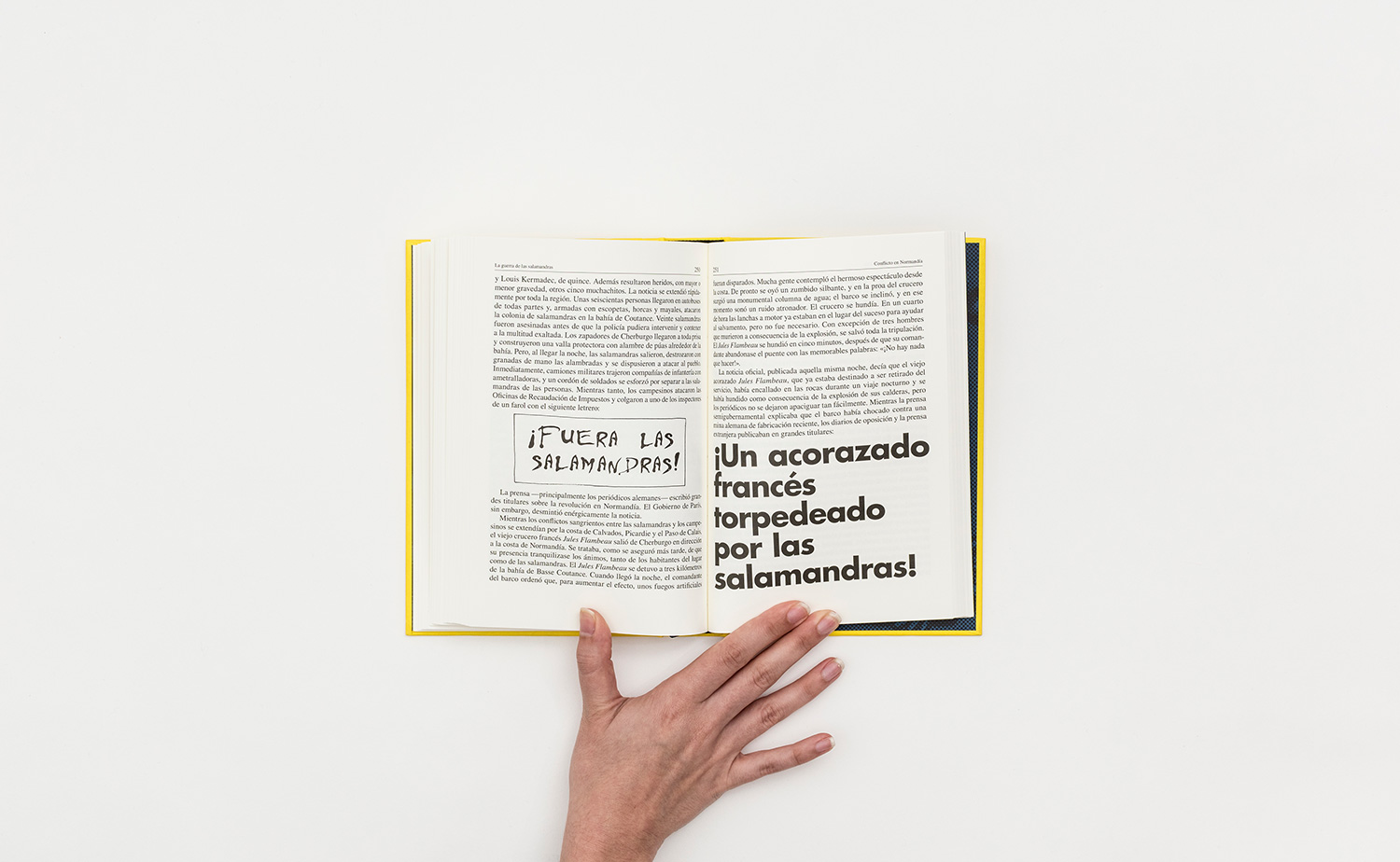 Estamos ante una historia inusual en apariencia, pero con un trasfondo que es aplicable a cualquier rincón de nuestro planeta. Esta novela de Karel Čapek (1890-1938) nos acerca a una fábula en la que los humanos, una vez más, tratan de sacar tajada de la explotación de otros seres, en este caso, las salamandras, que viven pacíficamente en la isla del Diablo. Y, una historia que de entrada ya incita a su lectura por lo curiosa y original, nos deja KO con el trabajo de ilustración de Hans Ticha (1940), inspirado en el Pop Art, el cubismo y el cartelismo ruso, y con un trabajo muy interesante en cuanto a tipografía.