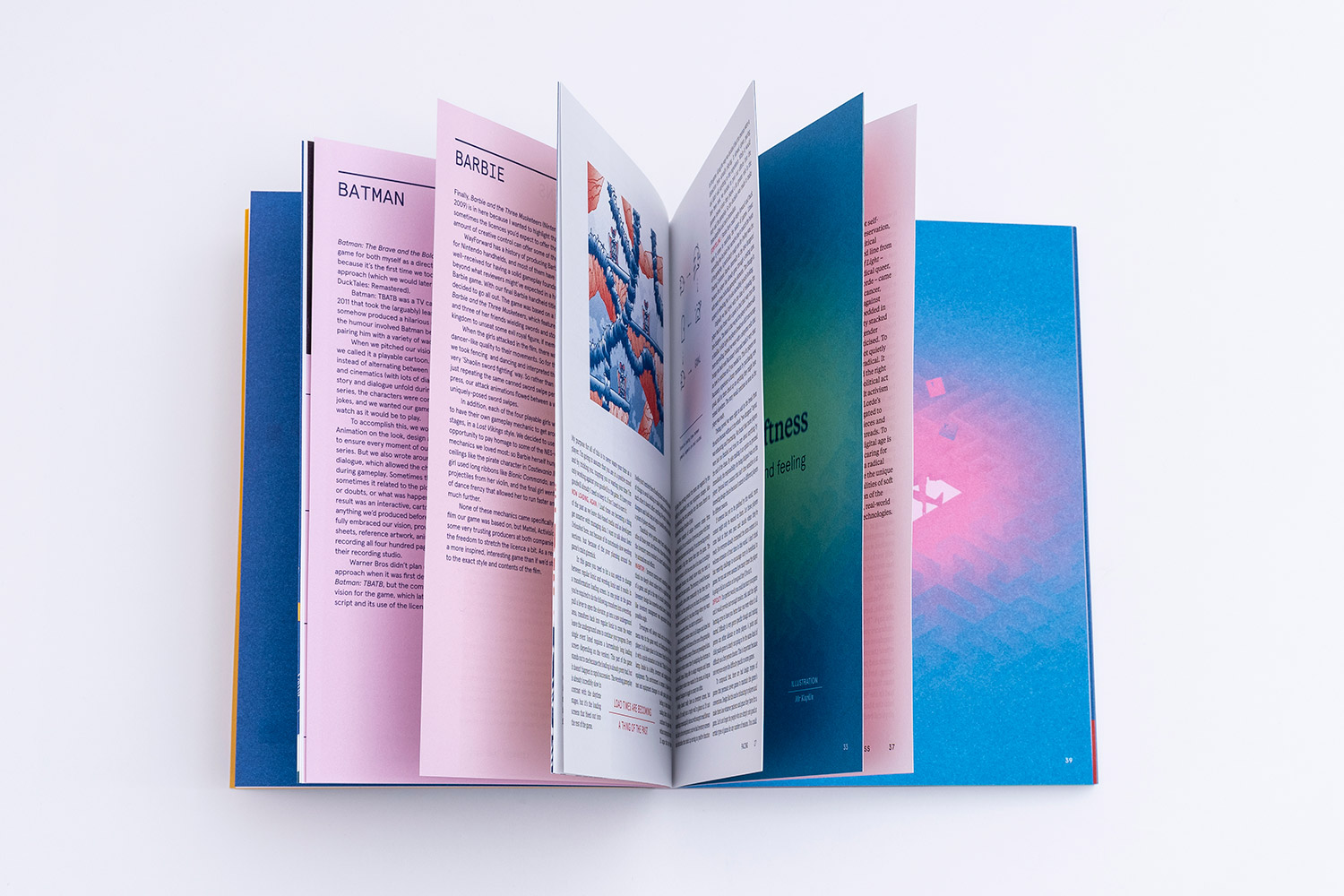 Basta con sostener A profound waste of time un instante, para apreciar su aura de producto «calitoso» y condición de «revista objeto». Además del gramaje y calidad de su papel (impreso en Munken Lynx de Artic Papers), incluye una lámina impresa a través de risografía, pliegos desplegables en vertical, y un pequeño encarte impreso en blanco y negro (con unas capitulares ilustradas maravillosas). Enmarcar un producto con este diseño de calidad, en un envoltorio que no le hiciera justicia, hubiera constituido un gravísimo error.