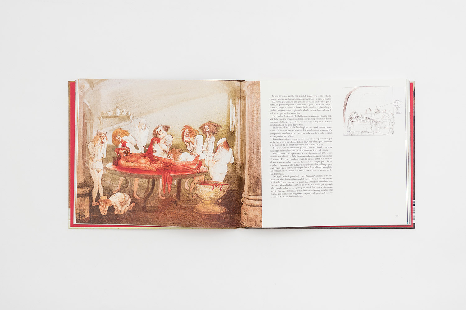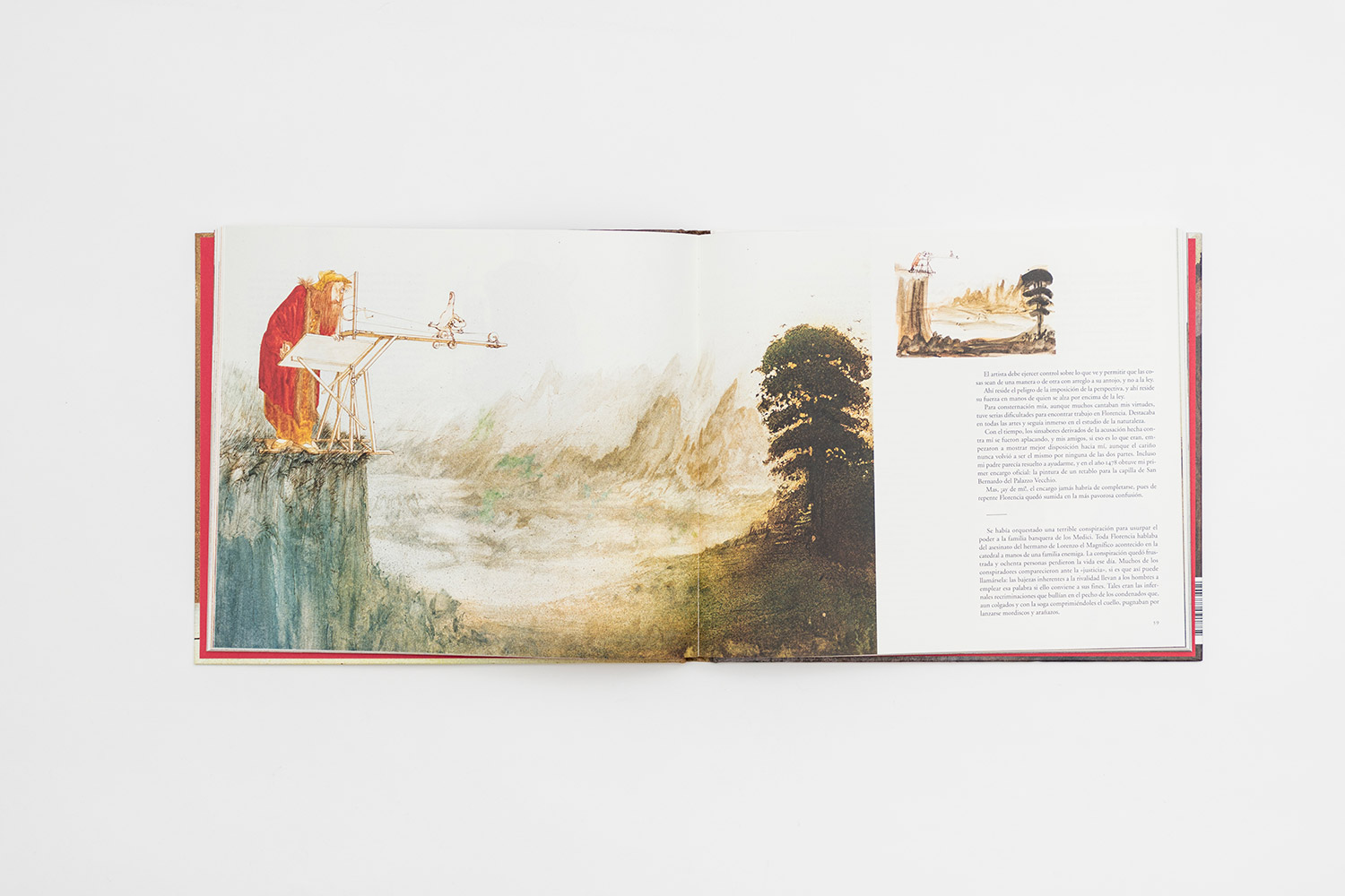 Con su estilo inconfundible y su destreza inigualable en el manejo de la tinta, el artista recrea la atmósfera artística y política renacentista. Fiel a su estilo y a su manejo de la tinta, Steadman da vida a los personajes más influyentes y relevantes en la biografía del genio italiano.